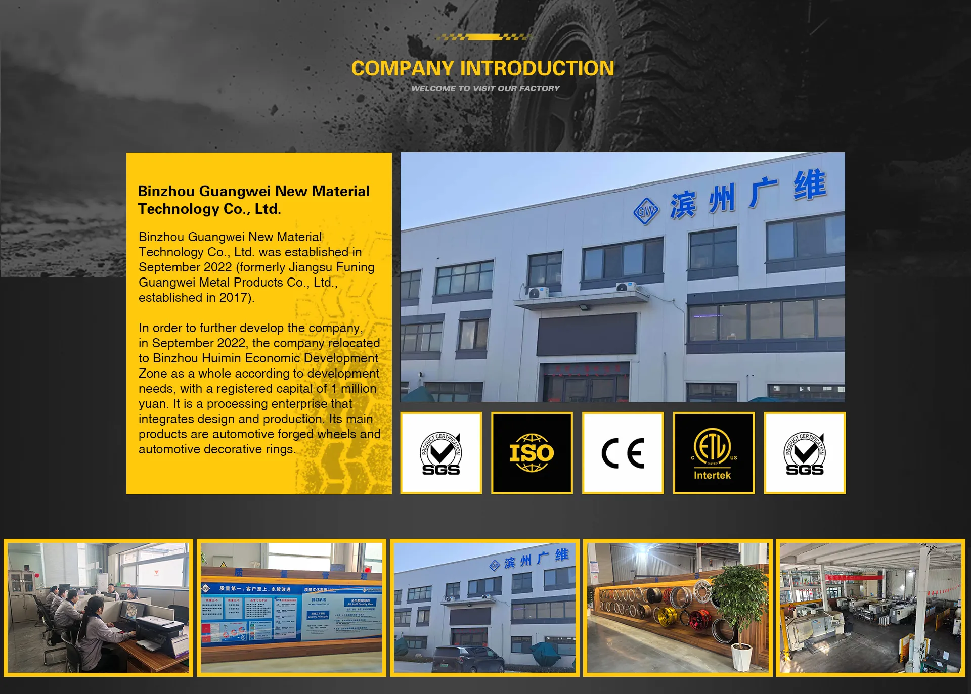 滨州广维新材料科技有限公司成立于2022年9月(原江苏阜宁广维金属制品有限公司,成立于2017年),为了公司更进一步的发展,2022年9月公司根据发展需要,整体搬迁至滨州市惠民经济开发区,注册资本100万元,是及设计、生产一体的加工型企业,主要产品是汽车锻造轮毂以及汽车装饰环。 在多年的金属加工行业中,秉承着为客户创造最大的利益、以质量为本,信誉第一的最终目标,做到最优惠的价格...